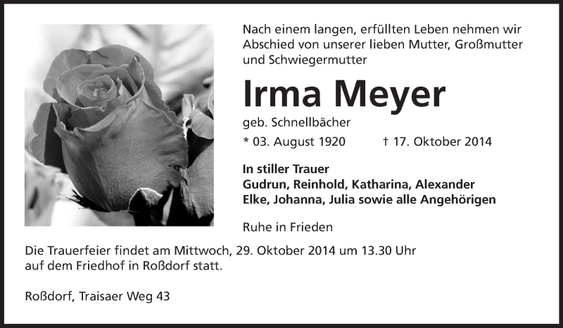 Hier finden Sie alle Traueranzeigen aus der Zeitung, die bisher für Irma Meyer erschienen sind. Weitere Traueranzeigen, die in der Zeitung erscheinen, werden hier ebenfalls aufgelistet