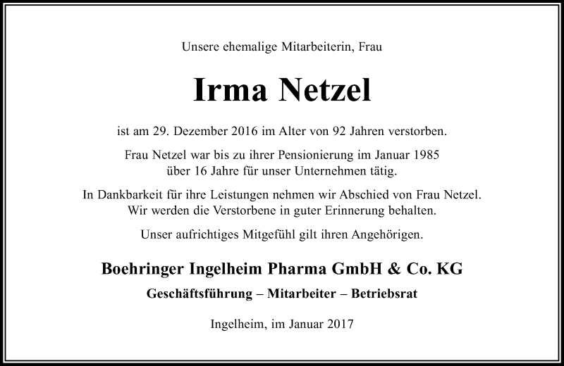 Hier finden Sie alle Traueranzeigen aus der Zeitung, die bisher für Irma Netzel erschienen sind. Weitere Traueranzeigen, die in der Zeitung erscheinen, werden hier ebenfalls aufgelistet