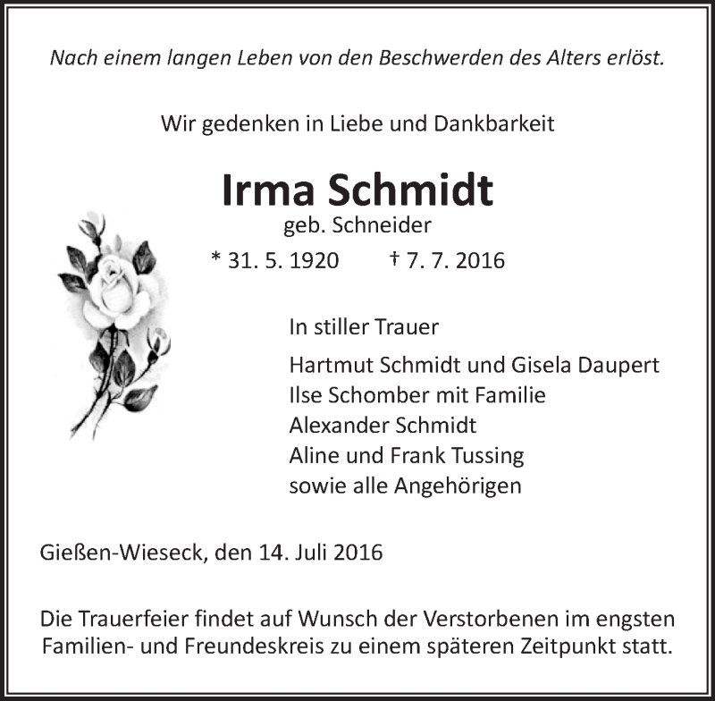 Hier finden Sie alle Traueranzeigen aus der Zeitung, die bisher für Irma Schmidt erschienen sind. Weitere Traueranzeigen, die in der Zeitung erscheinen, werden hier ebenfalls aufgelistet