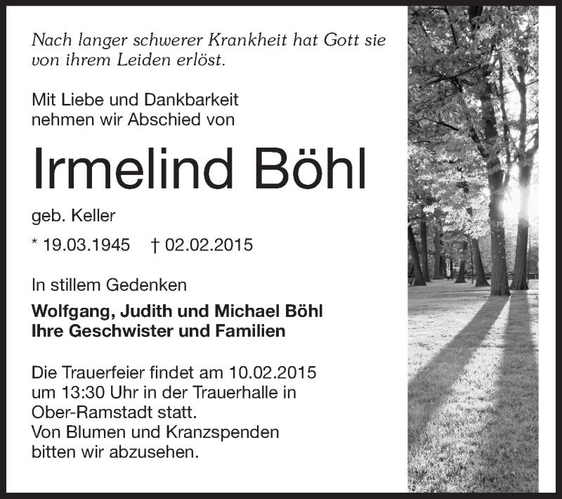 Hier finden Sie alle Traueranzeigen aus der Zeitung, die bisher für Irmelind Böhl erschienen sind. Weitere Traueranzeigen, die in der Zeitung erscheinen, werden hier ebenfalls aufgelistet