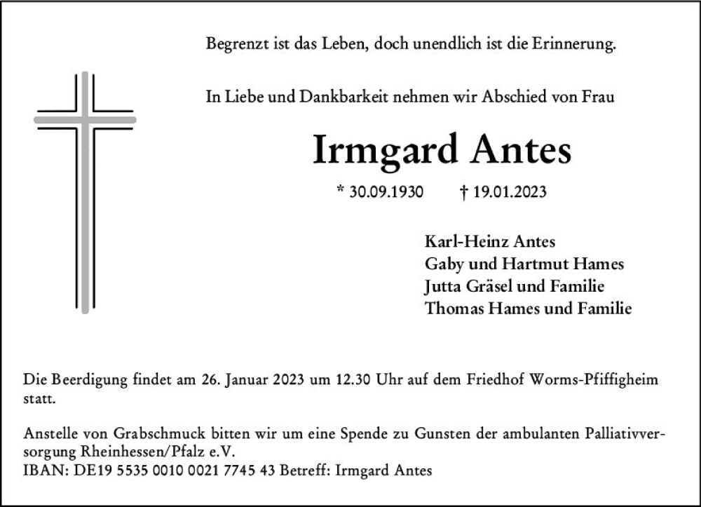 Hier finden Sie alle Traueranzeigen aus der Zeitung, die bisher für Irmgard Antes erschienen sind. Weitere Traueranzeigen, die in der Zeitung erscheinen, werden hier ebenfalls aufgelistet