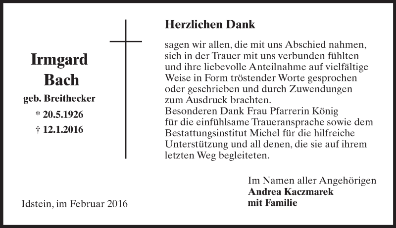 Hier finden Sie alle Traueranzeigen aus der Zeitung, die bisher für Irmgard Bach erschienen sind. Weitere Traueranzeigen, die in der Zeitung erscheinen, werden hier ebenfalls aufgelistet