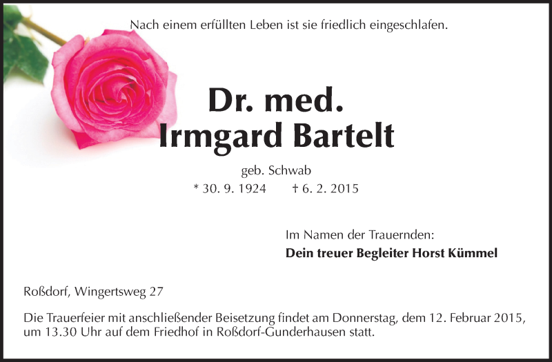 Hier finden Sie alle Traueranzeigen aus der Zeitung, die bisher für Irmgard Bartelt erschienen sind. Weitere Traueranzeigen, die in der Zeitung erscheinen, werden hier ebenfalls aufgelistet