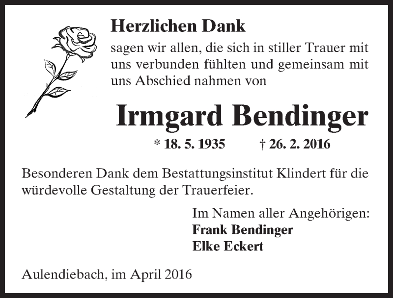 Hier finden Sie alle Traueranzeigen aus der Zeitung, die bisher für Irmgard Bendinger erschienen sind. Weitere Traueranzeigen, die in der Zeitung erscheinen, werden hier ebenfalls aufgelistet