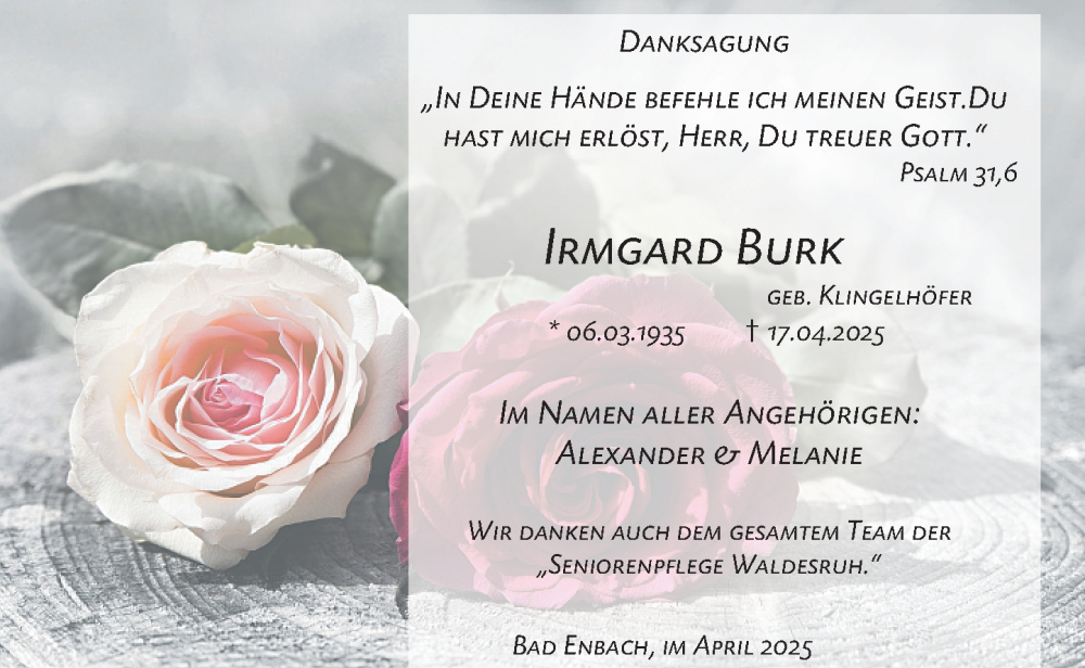 Hier finden Sie alle Traueranzeigen aus der Zeitung, die bisher für Irmgard Burk erschienen sind. Weitere Traueranzeigen, die in der Zeitung erscheinen, werden hier ebenfalls aufgelistet