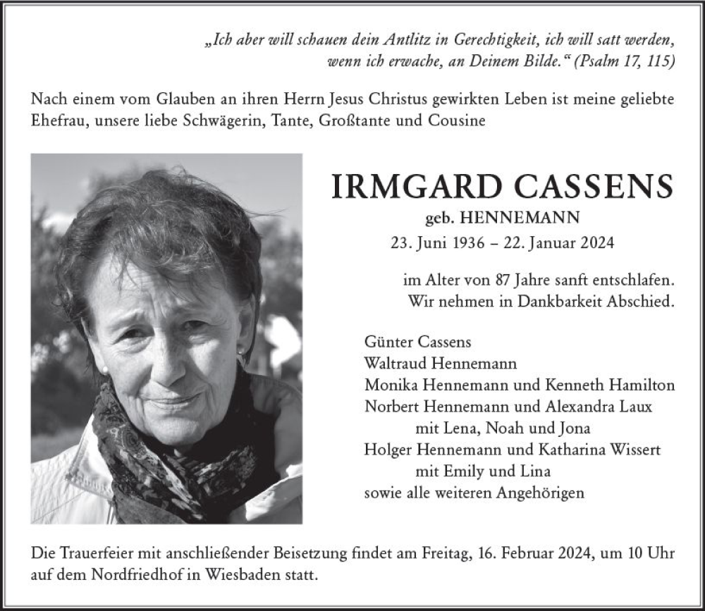 Hier finden Sie alle Traueranzeigen aus der Zeitung, die bisher für Irmgard Cassens erschienen sind. Weitere Traueranzeigen, die in der Zeitung erscheinen, werden hier ebenfalls aufgelistet