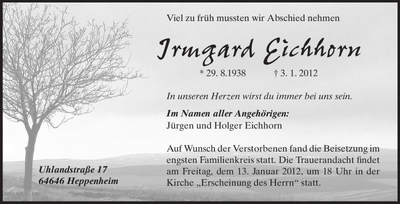 Hier finden Sie alle Traueranzeigen aus der Zeitung, die bisher für Irmgard Eichhorn erschienen sind. Weitere Traueranzeigen, die in der Zeitung erscheinen, werden hier ebenfalls aufgelistet