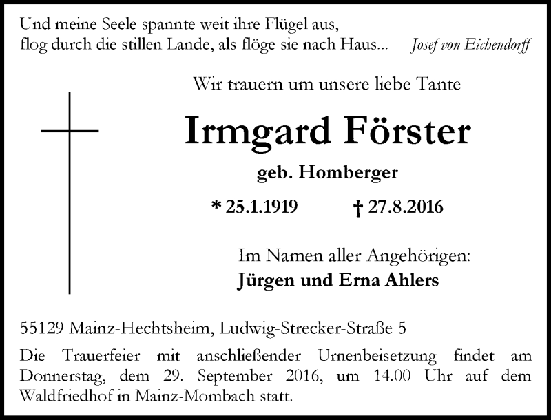 Hier finden Sie alle Traueranzeigen aus der Zeitung, die bisher für Irmgard Förster erschienen sind. Weitere Traueranzeigen, die in der Zeitung erscheinen, werden hier ebenfalls aufgelistet