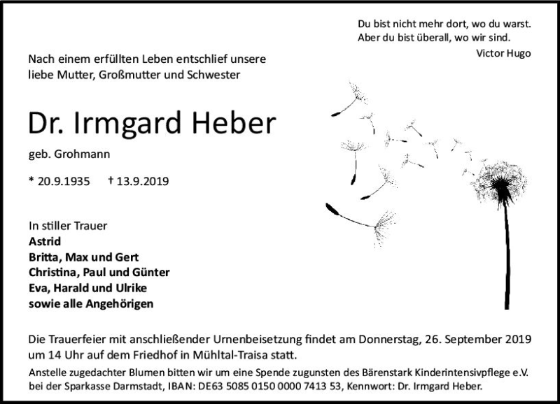 Hier finden Sie alle Traueranzeigen aus der Zeitung, die bisher für Irmgard Heber erschienen sind. Weitere Traueranzeigen, die in der Zeitung erscheinen, werden hier ebenfalls aufgelistet