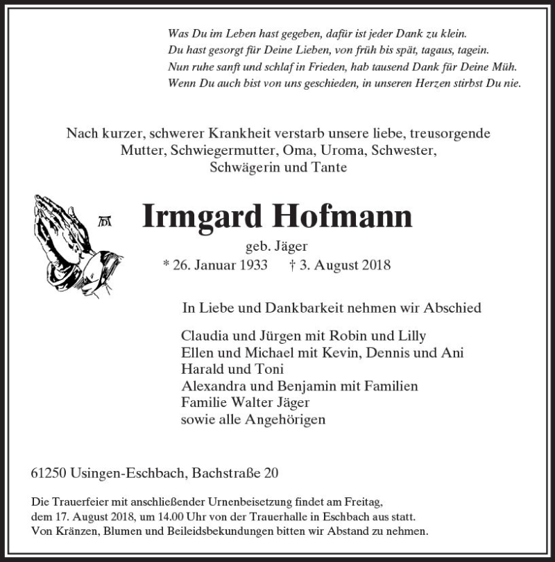 Hier finden Sie alle Traueranzeigen aus der Zeitung, die bisher für Irmgard Hofmann erschienen sind. Weitere Traueranzeigen, die in der Zeitung erscheinen, werden hier ebenfalls aufgelistet