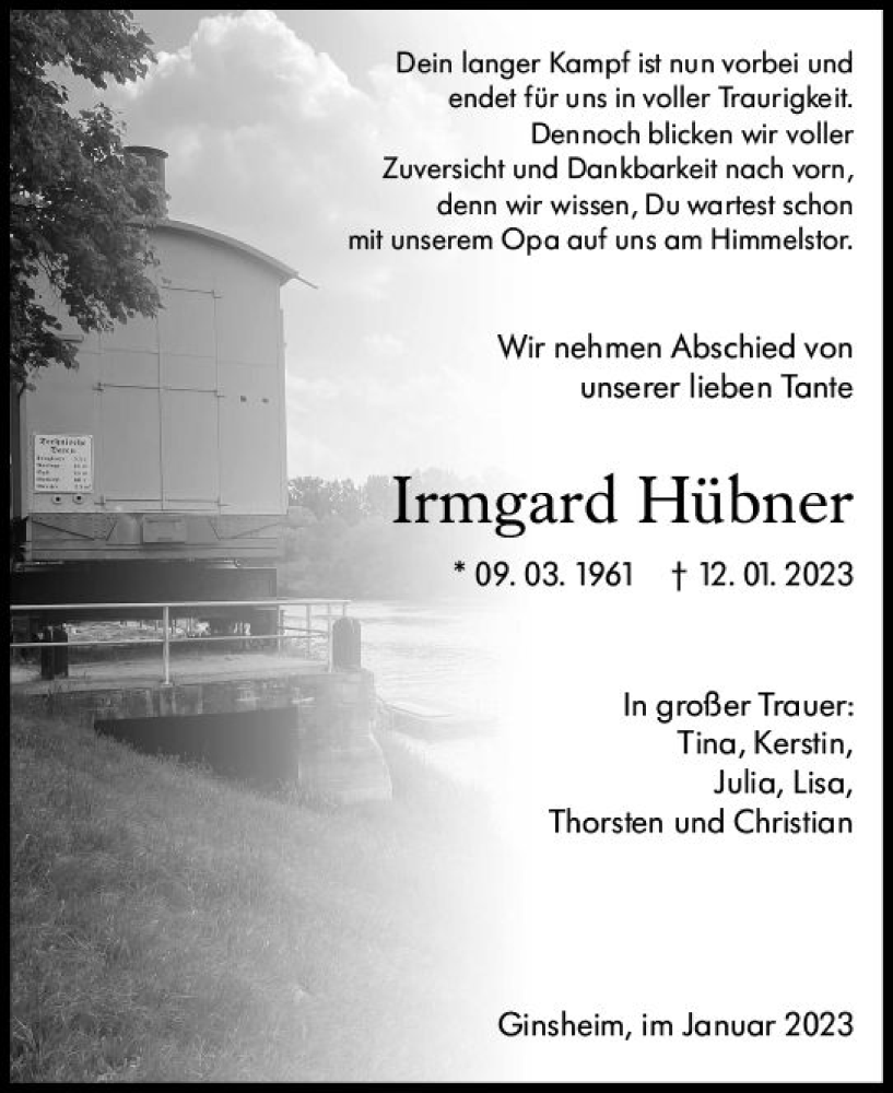 Hier finden Sie alle Traueranzeigen aus der Zeitung, die bisher für Irmgard Hübner erschienen sind. Weitere Traueranzeigen, die in der Zeitung erscheinen, werden hier ebenfalls aufgelistet