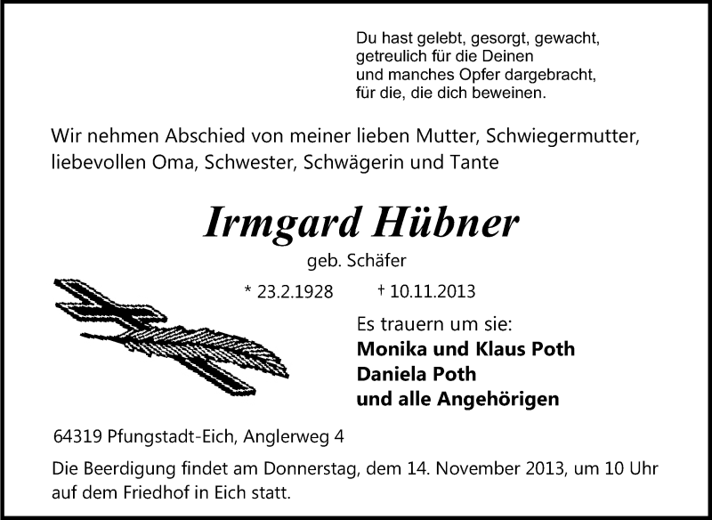 Hier finden Sie alle Traueranzeigen aus der Zeitung, die bisher für Irmgard Hübner erschienen sind. Weitere Traueranzeigen, die in der Zeitung erscheinen, werden hier ebenfalls aufgelistet