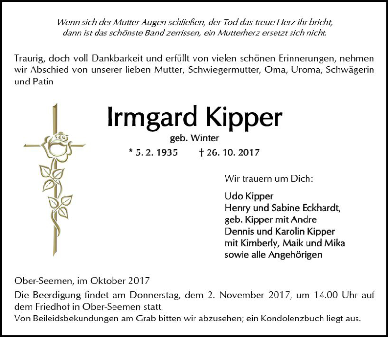 Hier finden Sie alle Traueranzeigen aus der Zeitung, die bisher für Irmgard Kipper erschienen sind. Weitere Traueranzeigen, die in der Zeitung erscheinen, werden hier ebenfalls aufgelistet