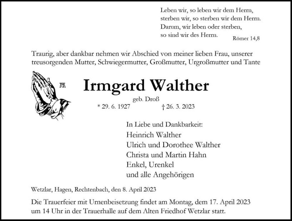 Hier finden Sie alle Traueranzeigen aus der Zeitung, die bisher für Irmgard Walther erschienen sind. Weitere Traueranzeigen, die in der Zeitung erscheinen, werden hier ebenfalls aufgelistet