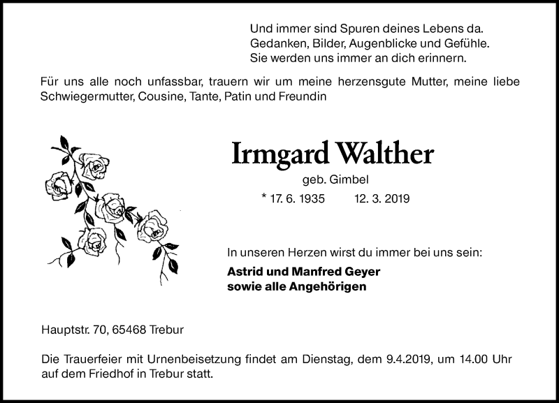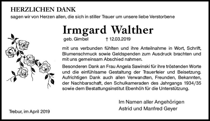 Hier finden Sie alle Traueranzeigen aus der Zeitung, die bisher für Irmgard Walther erschienen sind. Weitere Traueranzeigen, die in der Zeitung erscheinen, werden hier ebenfalls aufgelistet