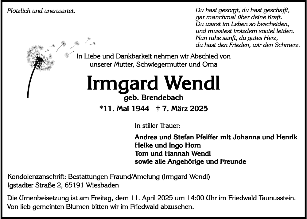 Hier finden Sie alle Traueranzeigen aus der Zeitung, die bisher für Irmgard Wendl erschienen sind. Weitere Traueranzeigen, die in der Zeitung erscheinen, werden hier ebenfalls aufgelistet