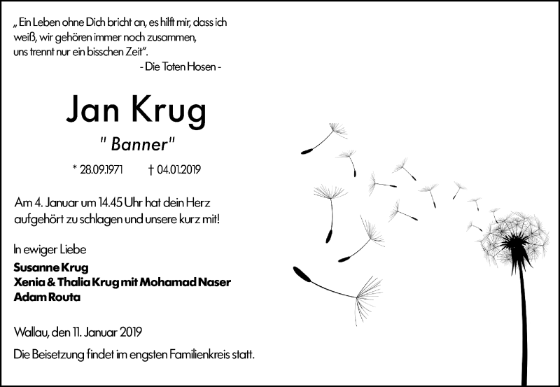 Hier finden Sie alle Traueranzeigen aus der Zeitung, die bisher für Jan Krug erschienen sind. Weitere Traueranzeigen, die in der Zeitung erscheinen, werden hier ebenfalls aufgelistet