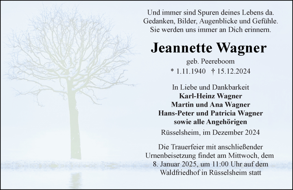 Hier finden Sie alle Traueranzeigen aus der Zeitung, die bisher für Jeannette Wagner erschienen sind. Weitere Traueranzeigen, die in der Zeitung erscheinen, werden hier ebenfalls aufgelistet