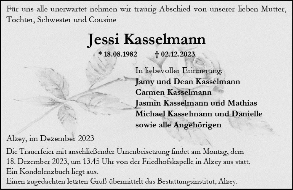 Hier finden Sie alle Traueranzeigen aus der Zeitung, die bisher für Jessi Kasselmann erschienen sind. Weitere Traueranzeigen, die in der Zeitung erscheinen, werden hier ebenfalls aufgelistet
