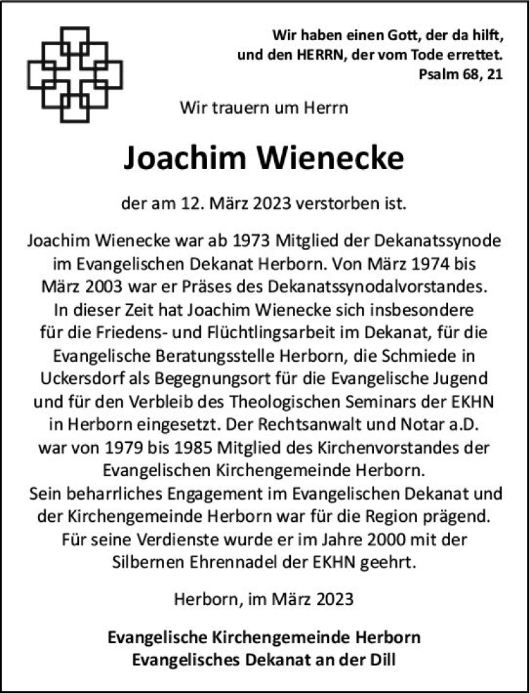 Hier finden Sie alle Traueranzeigen aus der Zeitung, die bisher für Joachim Wienecke erschienen sind. Weitere Traueranzeigen, die in der Zeitung erscheinen, werden hier ebenfalls aufgelistet