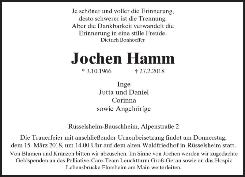 Hier finden Sie alle Traueranzeigen aus der Zeitung, die bisher für Jochen Hamm erschienen sind. Weitere Traueranzeigen, die in der Zeitung erscheinen, werden hier ebenfalls aufgelistet