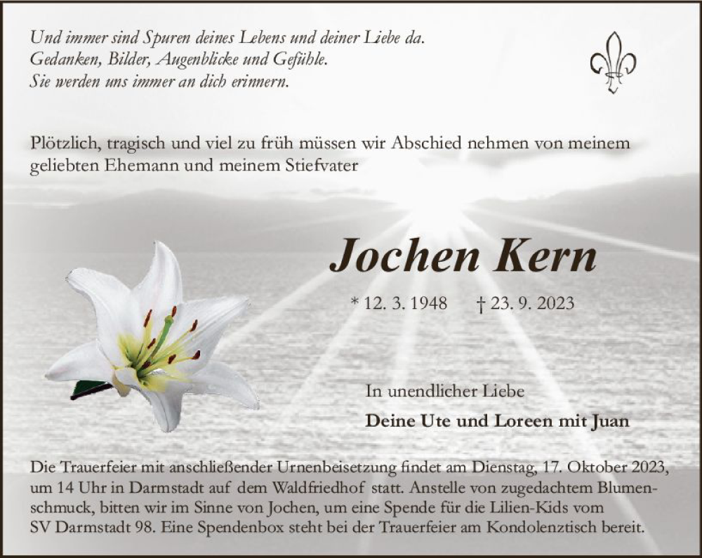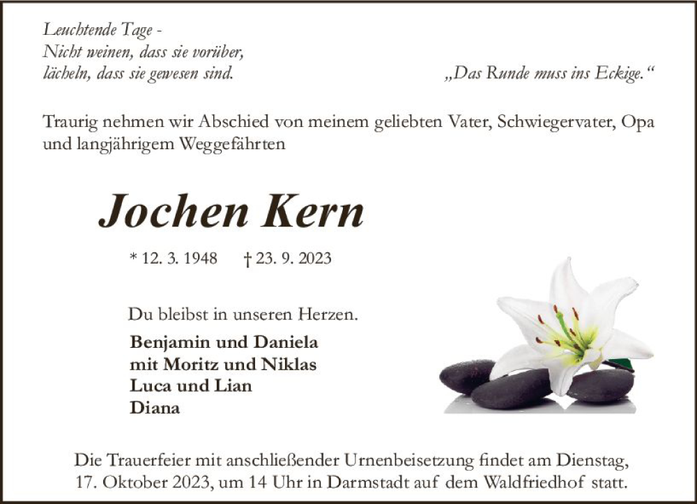 Hier finden Sie alle Traueranzeigen aus der Zeitung, die bisher für Jochen Kern erschienen sind. Weitere Traueranzeigen, die in der Zeitung erscheinen, werden hier ebenfalls aufgelistet