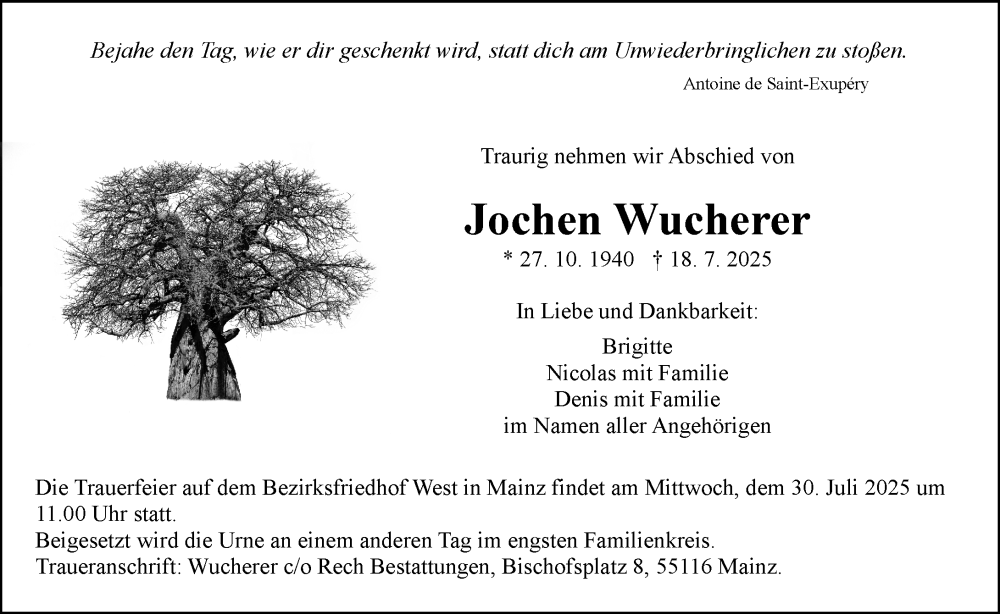 Hier finden Sie alle Traueranzeigen aus der Zeitung, die bisher für Jochen Wucherer erschienen sind. Weitere Traueranzeigen, die in der Zeitung erscheinen, werden hier ebenfalls aufgelistet