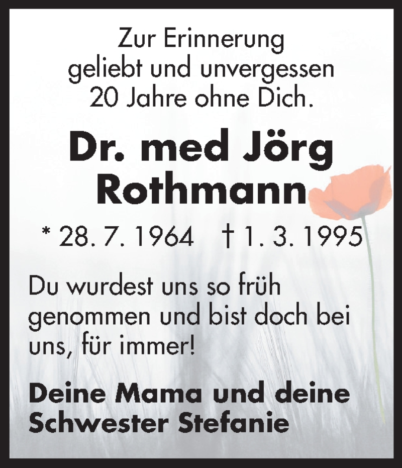 Hier finden Sie alle Traueranzeigen aus der Zeitung, die bisher für Jörg Rothmann erschienen sind. Weitere Traueranzeigen, die in der Zeitung erscheinen, werden hier ebenfalls aufgelistet