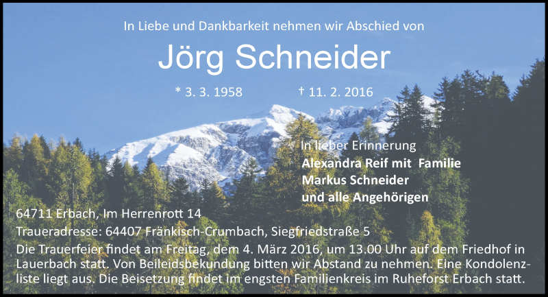 Hier finden Sie alle Traueranzeigen aus der Zeitung, die bisher für Jörg Schneider erschienen sind. Weitere Traueranzeigen, die in der Zeitung erscheinen, werden hier ebenfalls aufgelistet