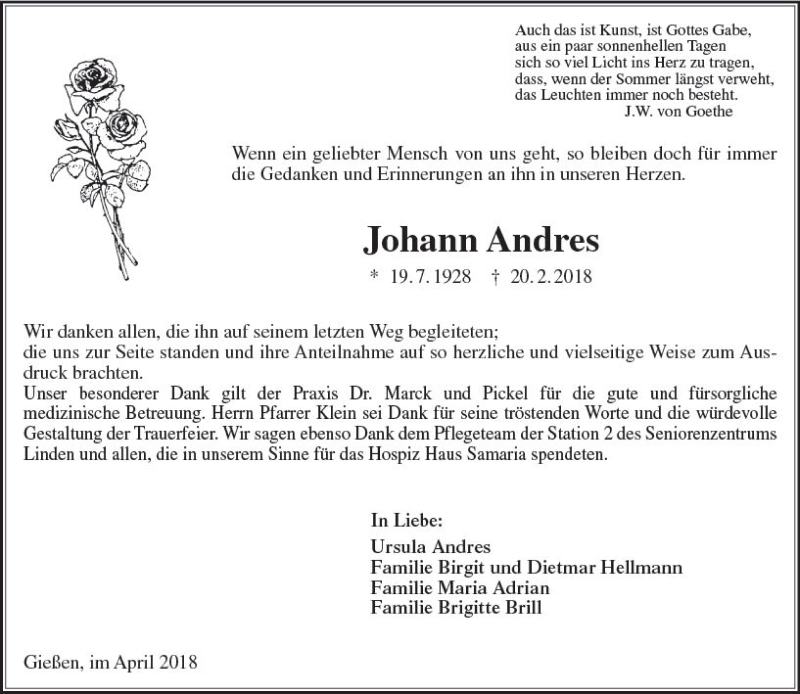 Hier finden Sie alle Traueranzeigen aus der Zeitung, die bisher für Johann Andres erschienen sind. Weitere Traueranzeigen, die in der Zeitung erscheinen, werden hier ebenfalls aufgelistet