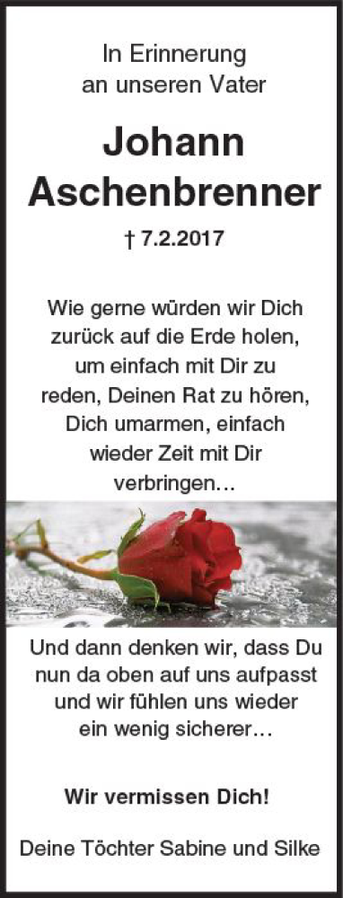 Hier finden Sie alle Traueranzeigen aus der Zeitung, die bisher für Johann Aschenbrenner erschienen sind. Weitere Traueranzeigen, die in der Zeitung erscheinen, werden hier ebenfalls aufgelistet