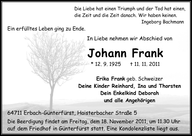 Hier finden Sie alle Traueranzeigen aus der Zeitung, die bisher für Johann Frank erschienen sind. Weitere Traueranzeigen, die in der Zeitung erscheinen, werden hier ebenfalls aufgelistet