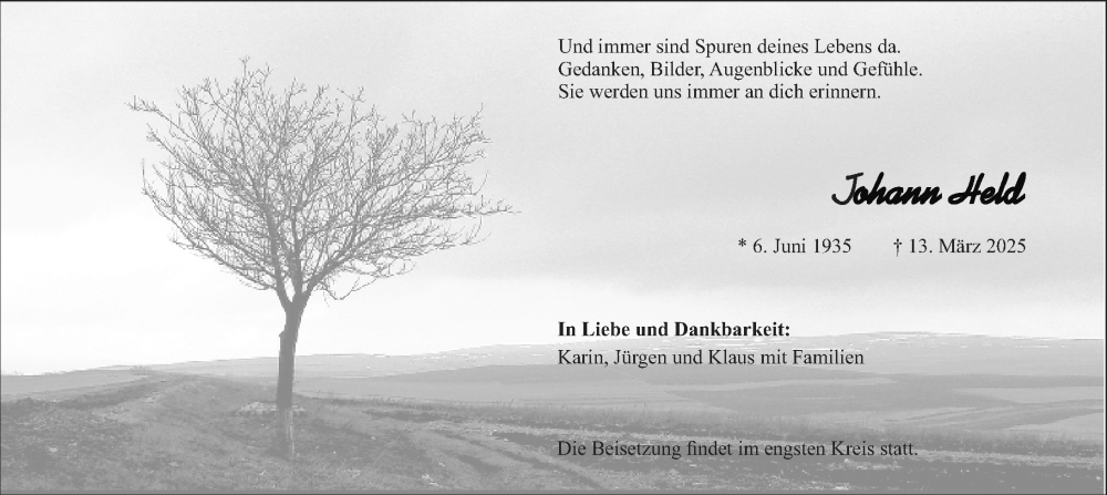 Hier finden Sie alle Traueranzeigen aus der Zeitung, die bisher für Johann Held erschienen sind. Weitere Traueranzeigen, die in der Zeitung erscheinen, werden hier ebenfalls aufgelistet