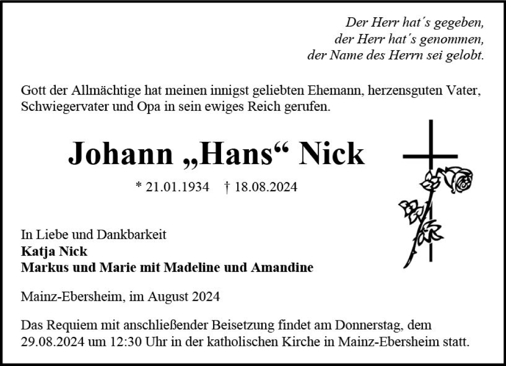 Hier finden Sie alle Traueranzeigen aus der Zeitung, die bisher für Johann Nick erschienen sind. Weitere Traueranzeigen, die in der Zeitung erscheinen, werden hier ebenfalls aufgelistet