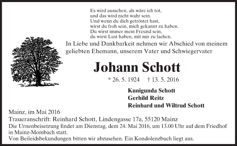 Hier finden Sie alle Traueranzeigen aus der Zeitung, die bisher für Johann Schott erschienen sind. Weitere Traueranzeigen, die in der Zeitung erscheinen, werden hier ebenfalls aufgelistet