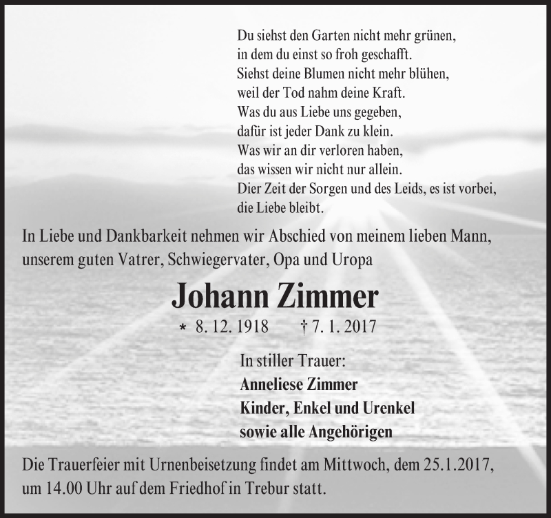 Hier finden Sie alle Traueranzeigen aus der Zeitung, die bisher für Johann Zimmer erschienen sind. Weitere Traueranzeigen, die in der Zeitung erscheinen, werden hier ebenfalls aufgelistet