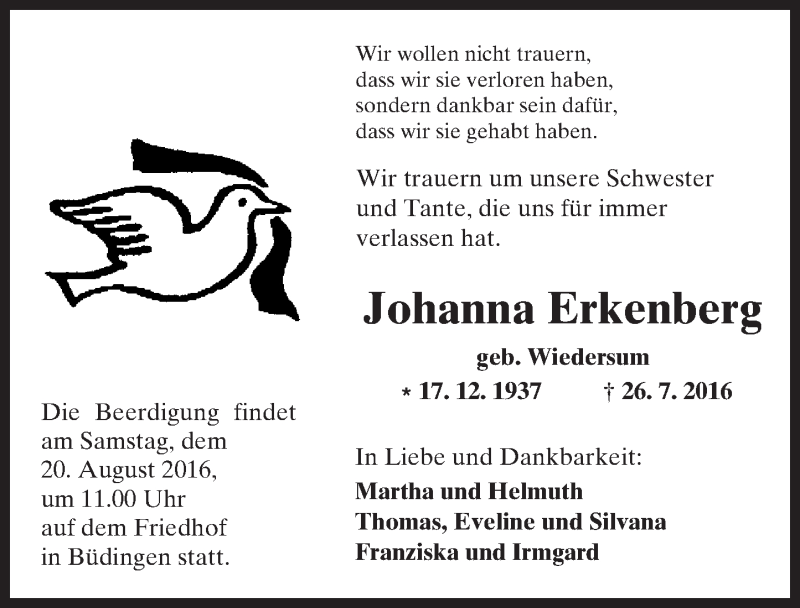 Hier finden Sie alle Traueranzeigen aus der Zeitung, die bisher für Johanna Erkenberg erschienen sind. Weitere Traueranzeigen, die in der Zeitung erscheinen, werden hier ebenfalls aufgelistet