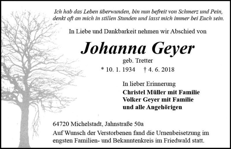 Hier finden Sie alle Traueranzeigen aus der Zeitung, die bisher für Johanna Geyer erschienen sind. Weitere Traueranzeigen, die in der Zeitung erscheinen, werden hier ebenfalls aufgelistet