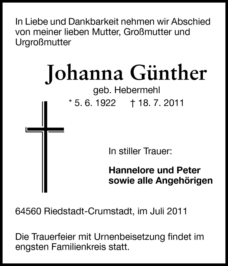 Hier finden Sie alle Traueranzeigen aus der Zeitung, die bisher für Johanna Günther erschienen sind. Weitere Traueranzeigen, die in der Zeitung erscheinen, werden hier ebenfalls aufgelistet