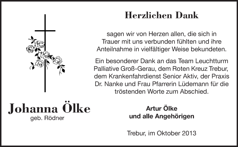 Hier finden Sie alle Traueranzeigen aus der Zeitung, die bisher für Johanna Ölke erschienen sind. Weitere Traueranzeigen, die in der Zeitung erscheinen, werden hier ebenfalls aufgelistet