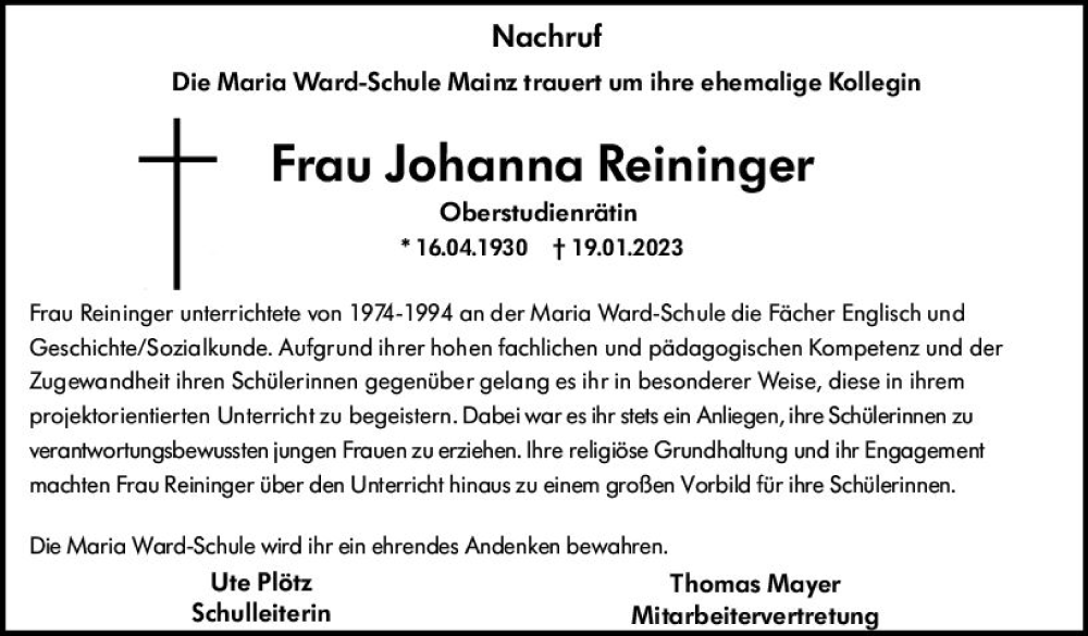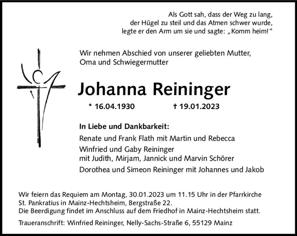 Hier finden Sie alle Traueranzeigen aus der Zeitung, die bisher für Johanna Reininger erschienen sind. Weitere Traueranzeigen, die in der Zeitung erscheinen, werden hier ebenfalls aufgelistet
