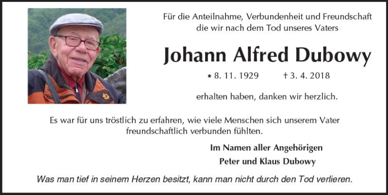 Hier finden Sie alle Traueranzeigen aus der Zeitung, die bisher für Johann Alfred Dubowy erschienen sind. Weitere Traueranzeigen, die in der Zeitung erscheinen, werden hier ebenfalls aufgelistet