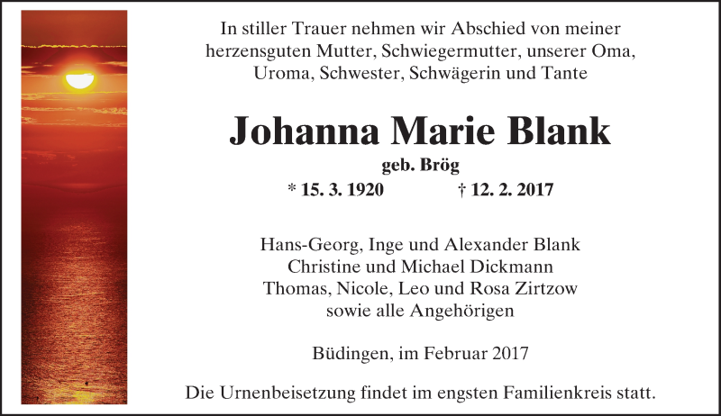 Hier finden Sie alle Traueranzeigen aus der Zeitung, die bisher für Johanna Marie Blank erschienen sind. Weitere Traueranzeigen, die in der Zeitung erscheinen, werden hier ebenfalls aufgelistet