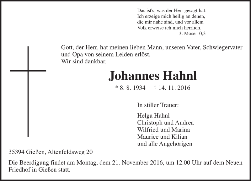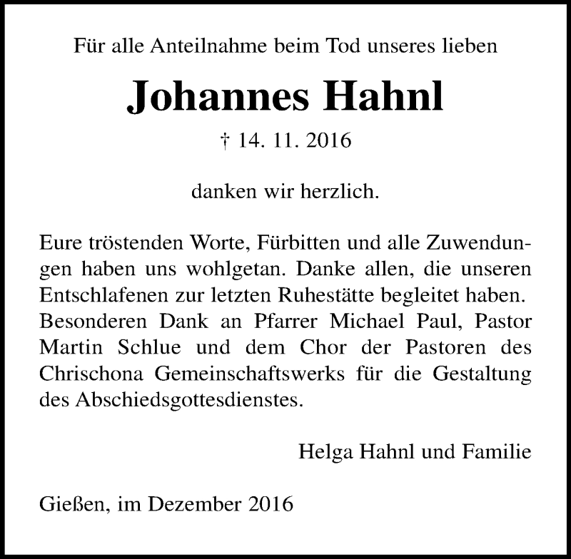 Hier finden Sie alle Traueranzeigen aus der Zeitung, die bisher für Johannes Hahnl erschienen sind. Weitere Traueranzeigen, die in der Zeitung erscheinen, werden hier ebenfalls aufgelistet