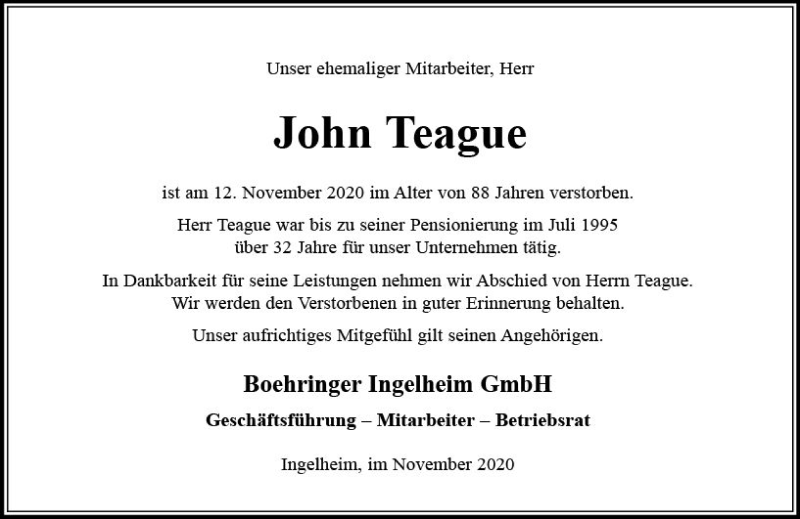 Hier finden Sie alle Traueranzeigen aus der Zeitung, die bisher für John Teague erschienen sind. Weitere Traueranzeigen, die in der Zeitung erscheinen, werden hier ebenfalls aufgelistet