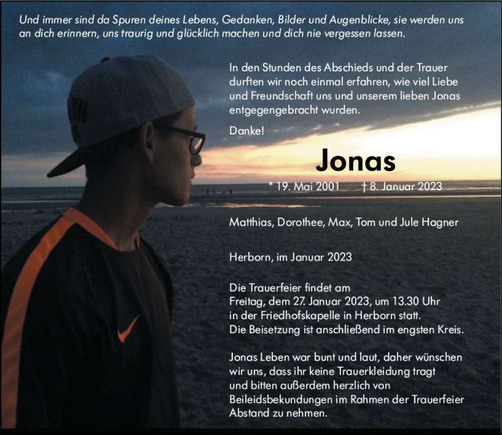 Hier finden Sie alle Traueranzeigen aus der Zeitung, die bisher für Jonas erschienen sind. Weitere Traueranzeigen, die in der Zeitung erscheinen, werden hier ebenfalls aufgelistet