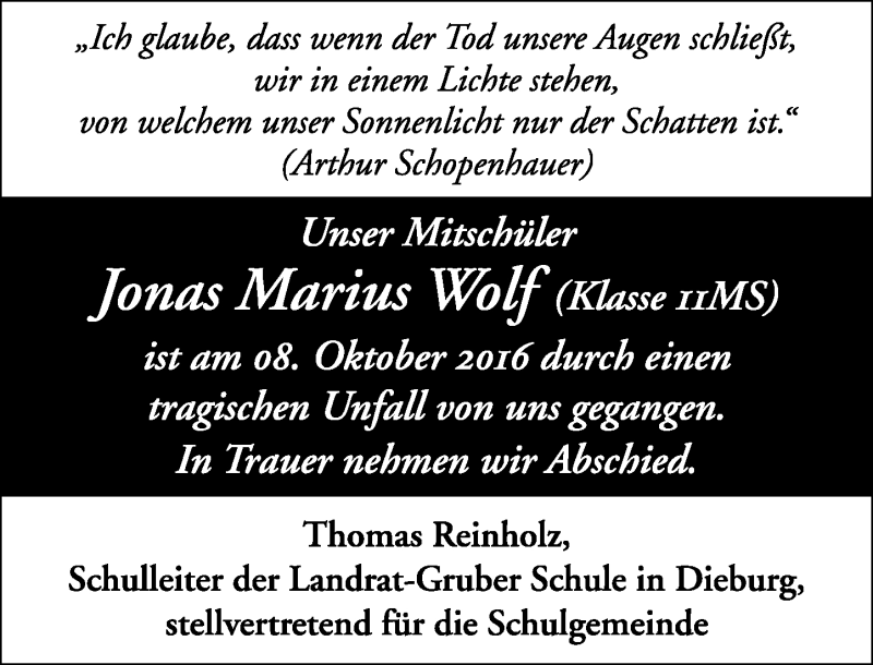 Hier finden Sie alle Traueranzeigen aus der Zeitung, die bisher für Jonas Marius Wolf erschienen sind. Weitere Traueranzeigen, die in der Zeitung erscheinen, werden hier ebenfalls aufgelistet