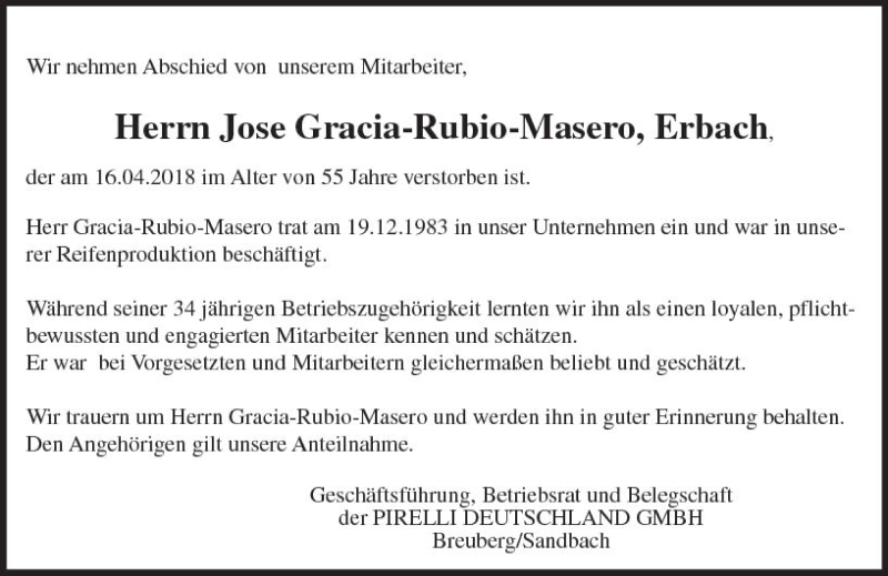 Hier finden Sie alle Traueranzeigen aus der Zeitung, die bisher für Jose Gracia-Rubio-Masero erschienen sind. Weitere Traueranzeigen, die in der Zeitung erscheinen, werden hier ebenfalls aufgelistet