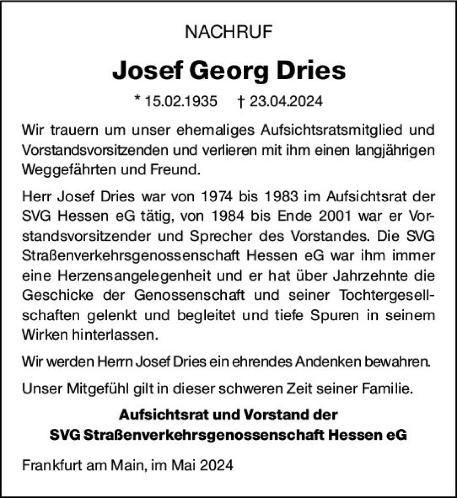 Hier finden Sie alle Traueranzeigen aus der Zeitung, die bisher für Josef Georg Dries erschienen sind. Weitere Traueranzeigen, die in der Zeitung erscheinen, werden hier ebenfalls aufgelistet