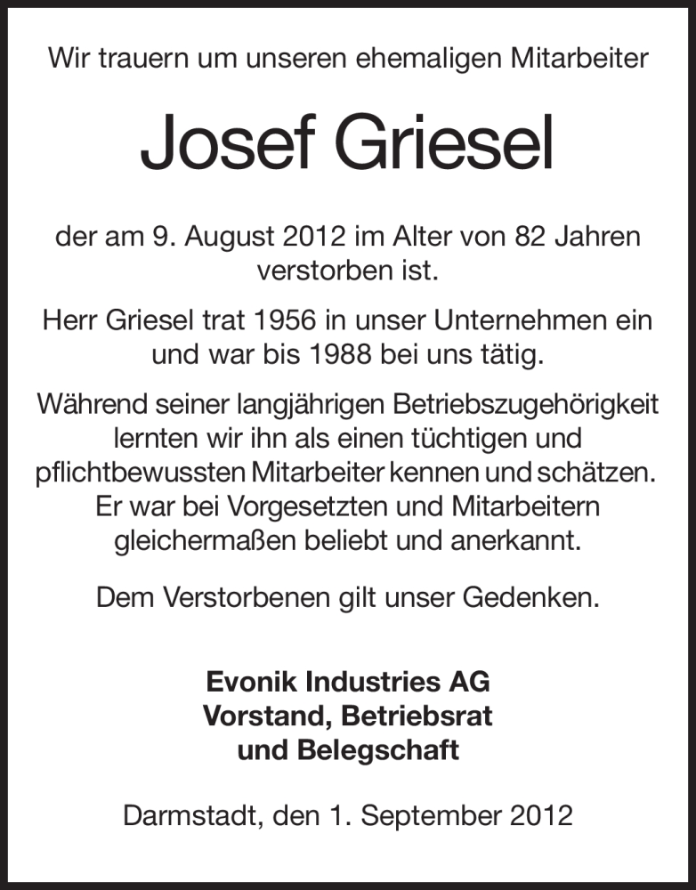 Hier finden Sie alle Traueranzeigen aus der Zeitung, die bisher für Josef Griesel erschienen sind. Weitere Traueranzeigen, die in der Zeitung erscheinen, werden hier ebenfalls aufgelistet